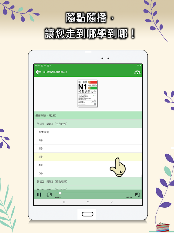 ● يمكنك اختيار "سؤال واحد" و "نوع سؤال واحد" و "سؤال اختبار كامل" لاختبار فهم الاستماع (مقارنة بالاستماع إلى ملفات صوتية بتنسيق MP3 ، يكون البحث عن المحتوى أكثر ملاءمة بمرور الوقت).