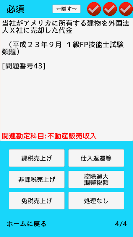 كما هو مذكور في "كيفية استخدام التطبيق" على الشاشة الرئيسية، فإن الأسئلة الموجودة في هذا التطبيق مشابهة لتلك الموجودة في امتحان محاسب الضرائب، وقد قمنا بإعداد الإجابات الصحيحة بناءً على الشرط الأساسي وهو "اختيار الطريقة التي تقلل العدد". من الأسئلة." ولذلك، إذا كان من الأفضل في حساب مبلغ الضريبة للفترة الحالية اعتماد الاستثناءات (الأحكام التي تسمح بـ ~) بدلاً من القواعد العامة لمعاملة معينة، فإن الإجابة الصحيحة هي استخدام الاستثناءات. يرجى حل المشكلات بناءً على المتطلبات الأساسية المدرجة في "كيفية استخدام التطبيق" على الشاشة الرئيسية.