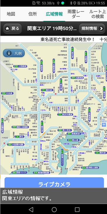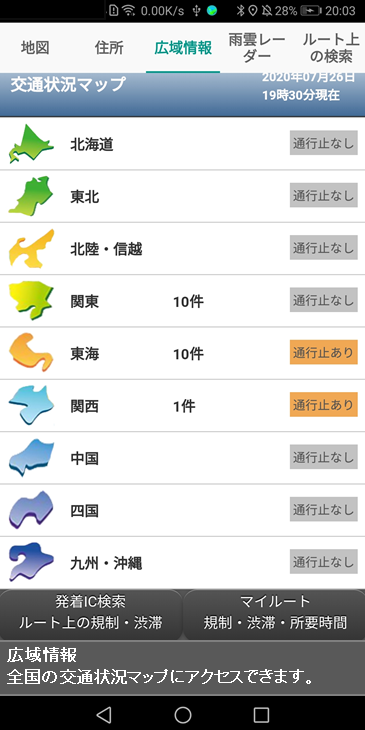 現在位置の渋滞情報を地図(通常地図、衛星写真、地形図)に表示します、広域情報、雨雲レーダー、出発ICから到着ICまでのルート上の規制・渋滞情報も表示します。