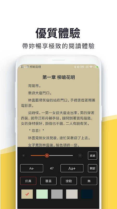 【優質體驗】翻頁流暢,排版精美,多種背景字體任意切換,帶妳暢享極致的閱讀體驗。