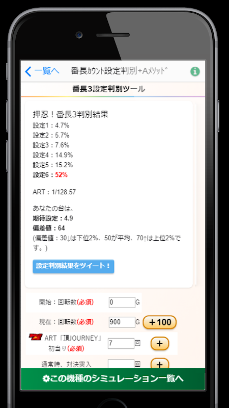 ・ゲーム数と大当たり回数を入力するだけで瞬時に設定を計算することができます。