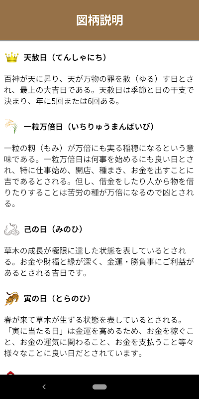 يمكنك أن ترى في لمحة أيقونات اليوم التي تعتبر يومًا جيدًا ، ويوم Tenshoku ، ومليون مرة ، و Kimi (Tomi) ، و Koshi (Kinoene) ، و Tora Day ، و My Day. .