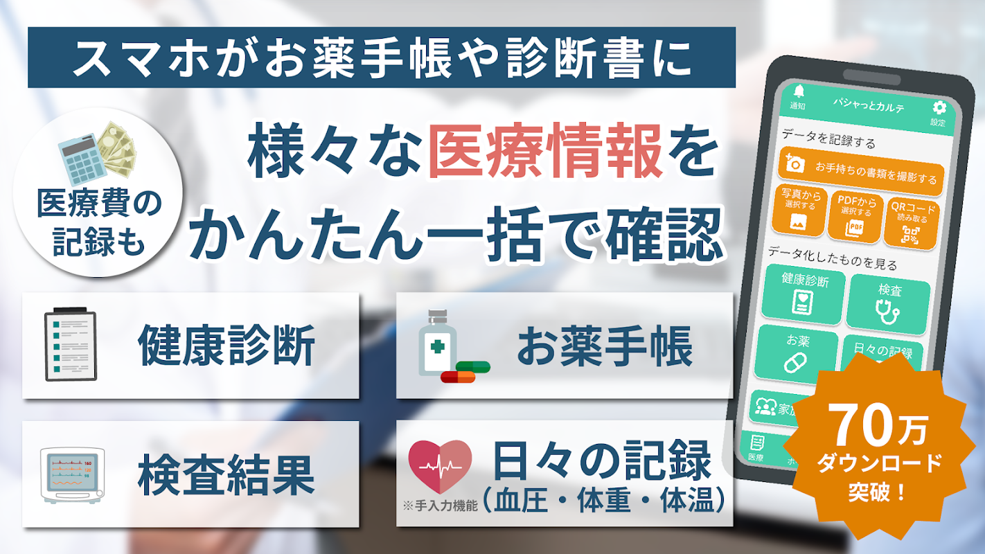 パシャっとカルテは健康診断や検査結果、処方箋などの医療情報をかんたんに記録できる健康管理アプリです。紙の書類を写真に撮るだけで自動でデータ化されるため、誰でも簡単に利用することが可能です。