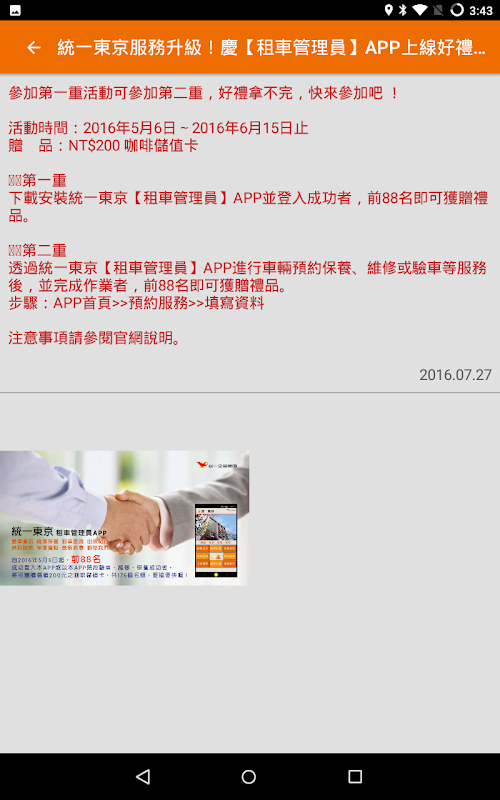 توحيد تطبيق العمل "توحيد طوكيو الحياة وتأجير" طوكيو لتزويد العملاء بالمعلومات على الإنترنت عن حالة المركبات المستأجرة ولحجز ضمان السيارة وخدمات فحص المركبات.