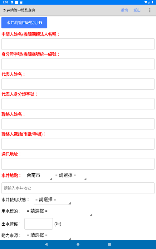 هذا التطبيق مخصص للجمهور للتعامل مع التطبيق والاستعلام عن آبار المياه الواقعة ضمن اختصاص مدينة تاينان.بالإضافة إلى القبول الكتابي وقبول صفحة الويب ، فإنه يوفر أيضًا طريقة قبول تطبيق الهاتف المحمول.