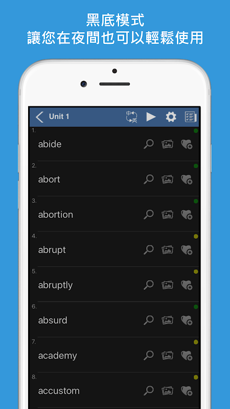 استخدام هذا التطبيق لتلاوة كلمة واحدة بسرعة فائقة! يحتوي حاليا على 7000 كلمة ، GEPT ، TOEFL ، TOEIC ، IELTS ، وجميع أنواع الأسئلة الأثرية!