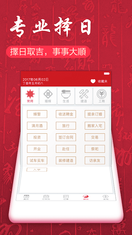★八字擇日:吉曆萬年曆依據周易命理和民俗習慣,依據參與人的生辰八字,嚴謹地選擇出合適參與人八字的黃道吉日,並且進行評分解析,讓參與人知道什麼時辰(幾點)做事更吉利。