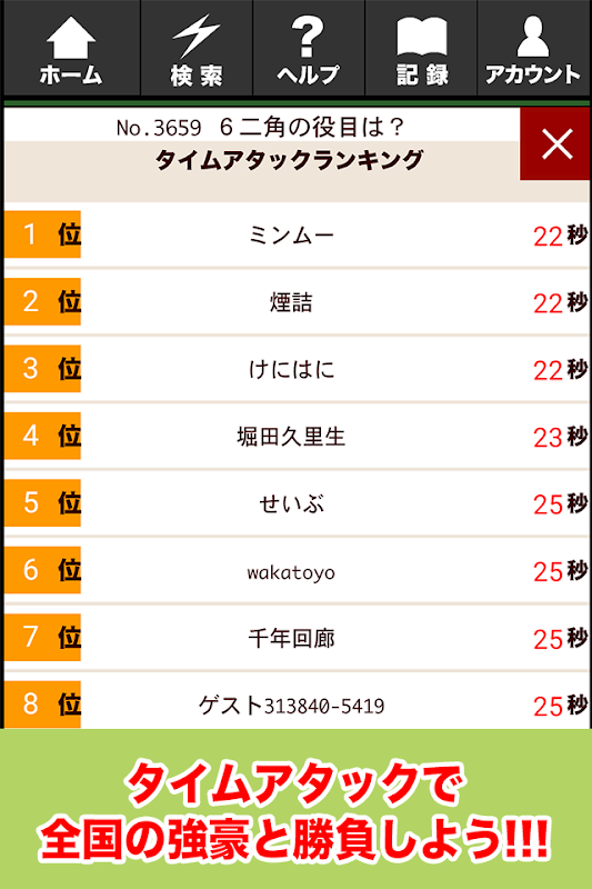 10問連続して解答してタイムを競います。クリアタイムが設定されてますので、そのタイム以内に解答し、且つ15人以内であるなら旗をGETできます。 旗を集めて詰友に自慢しよう。