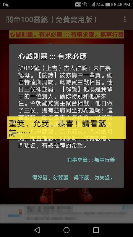 本中文正體字/繁體字100籤詩簡單易懂,還有普通白話解說,一看就明白。如果你遇事卻無法到祠廟裡求籤,必然心急如焚。請下載這款手機應用程式隨身備用,即可隨時隨地求籤,趨吉避凶。
