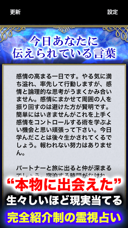 ※一度ご購入された占いも、「違った端末でアプリを再インストールした場合」や、「一度アプリをアンインストールしてから再度インストールし直した場合」には再購入が必要です。こちらご承知下さいませ。