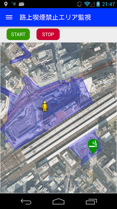現在位置が静岡市の路上喫煙禁止エリア内であるかを監視・通知するアプリケーションです。静岡市のオープンデータ「路上喫煙禁止エリアマップ」を使用しています。