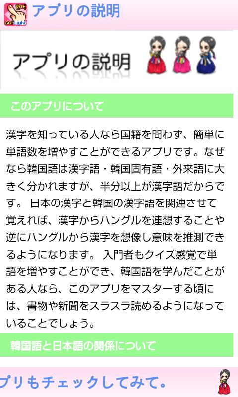 入門者もクイズ感覚で単語を増やすことができ、韓国語を学んだことがある人なら、このアプリをマスターする頃には、漢字を見ると、自然と頭の中でハングルに置き換えている!……そんな日が来るのもそう遠くないことでしょう。