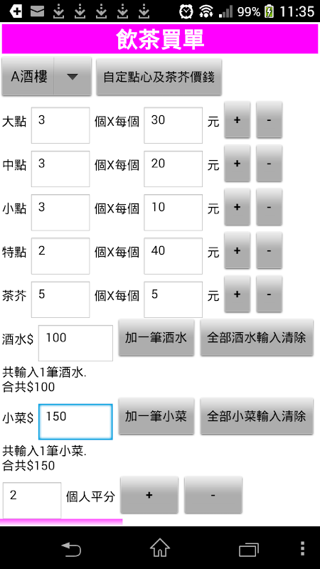 有沒有試過去茶樓飲茶時, 因為侍應出錯而導致被多收了錢的情況呢? 有了這個工具便可以更清楚及快捷地計算出總數. 更可同時計算出多人夾份時所須付款數目.