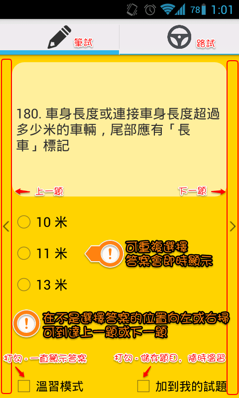 香港駕駛執照練習 ( 筆試及路試 ) 程式內包含了三百多條題目,多遵從運輸署的《道路使用者守則》,同時參巧網上所找到的類近測驗,以增加其準確性,希望能為考車牌的使用者帶來更好的溫習效果。