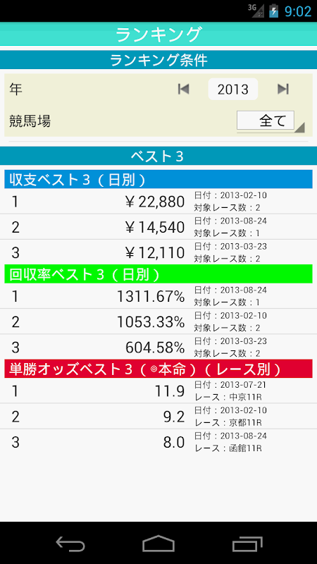 ・「収支ベスト3(日別)」「回収率ベスト3(日別)」「◎単勝オッズベスト3(レース別)」
