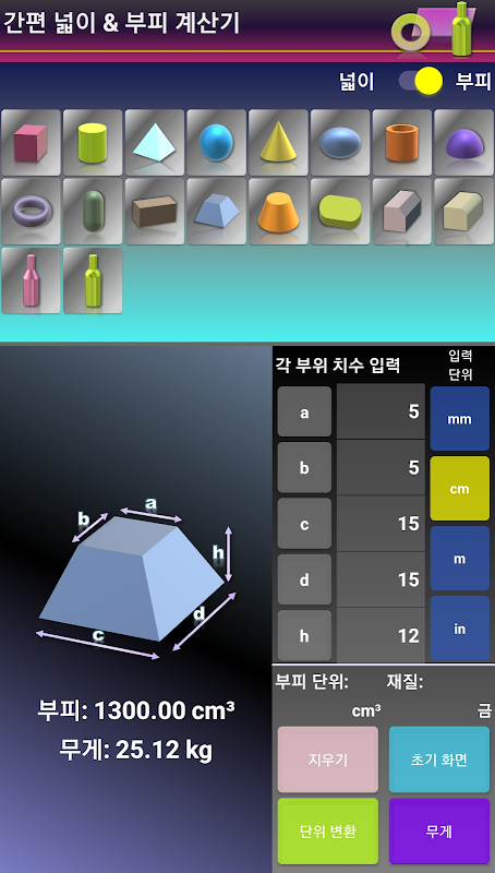 일반적으로 많이 사용되는 여러가지 모양의 면적과 부피를 쉽게 계산하기 위한 앱 입니다.