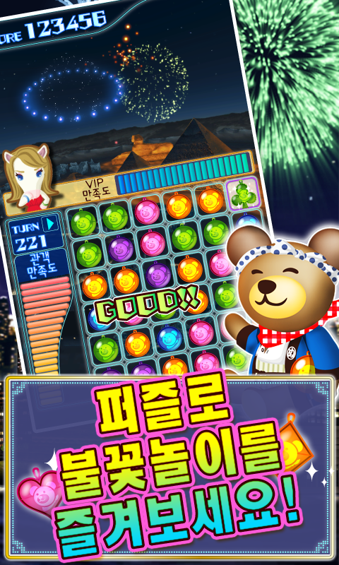 많은 VIP를 만족시키고 새로운 불꽃을 개발해 가면 곰돌이의 명성도 높아질 거예요!