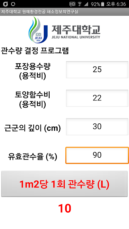 포장용수량과 토양함수비를 기준으로 근권 부분에 필요한 관수량을 계산해 주는 프로그램임.
