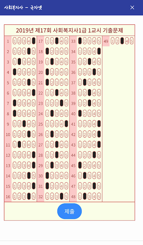 -. 각 회차별 기출 문제를 풀고 정답과 오답, 정답율 등의 결과를 바로 확인 하실 수 있습니다.