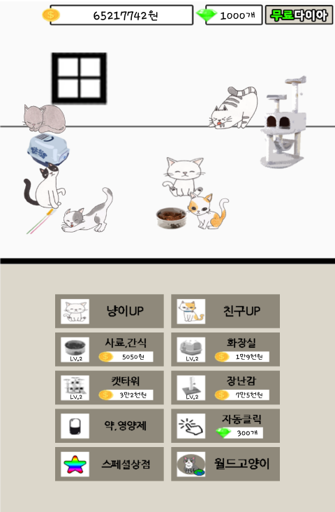 돈을 벌어 고양이를 키우고 꾸며주는 단순한 노가다 게임입니다