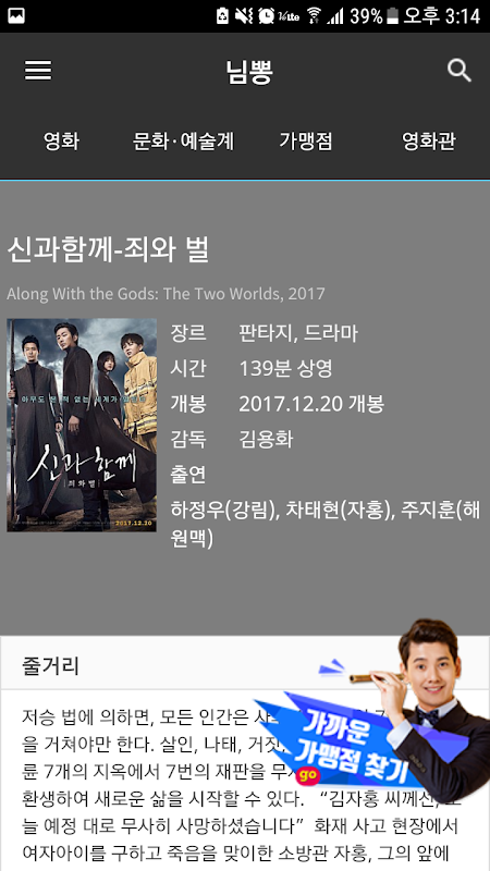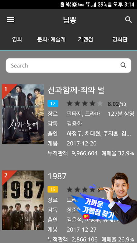 님뽕은 키워드와 지역기반의 검색 스마트앱으로 가맹점을 통해 다양한 이벤트와 할인정보도 제공하고 무료 또는 할인된 가격에 영화관람권을 제공받을수 있습니다.