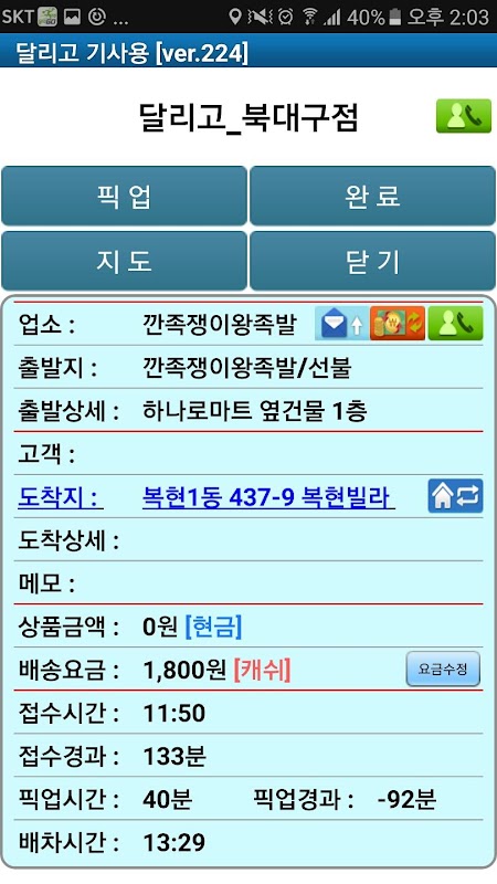 앱을 통하여 주문을 받은 배달대행 기사가 주문의 정보와 함께