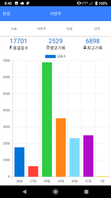* 통계기능 : 일별, 주차별, 월별로 사용자의 걸음 수를 알려주는 통계기능
