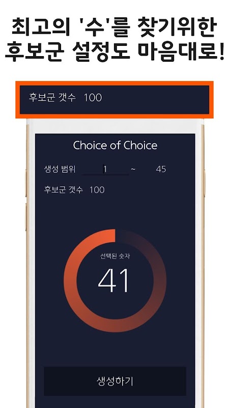 특히, “Choice of Choice 방식”은 사용자가 지정한 수 만큼의 어플 내부적으로 생성한 다음, 최적의 수를 하나 고르는 방식으로서, 숫자 중에서도 선택된 숫자를 고르는 기능을 제공하고 있습니다.