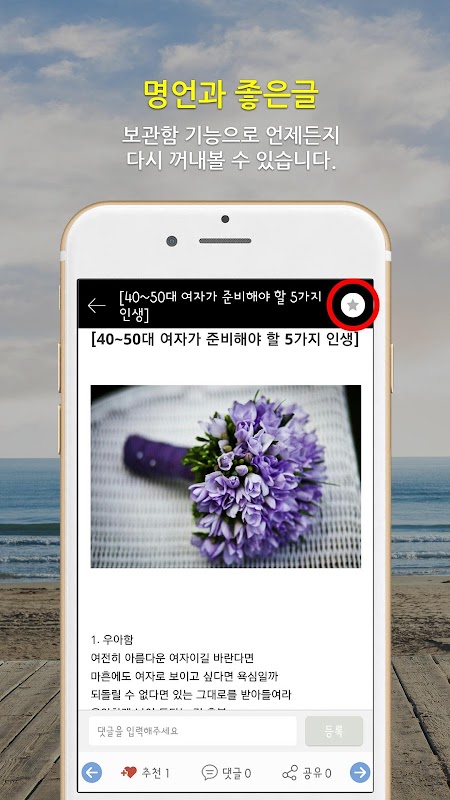 - 공유기능으로 명언, 사랑글귀, 좋은글, 마음가짐을 새롭게 해주는 글들을