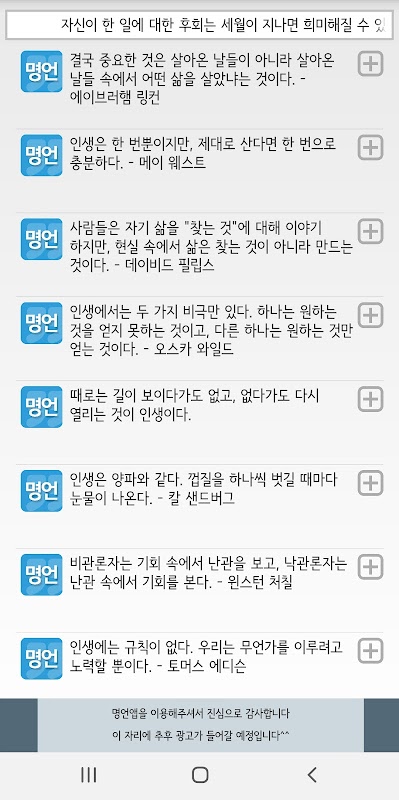- 마음에 드는 명언을 클릭하고 클릭한 명언부터 카테고리안에 있는 전체 명언을 10초마다 자동재생해서 감상하실 수 있습니다.