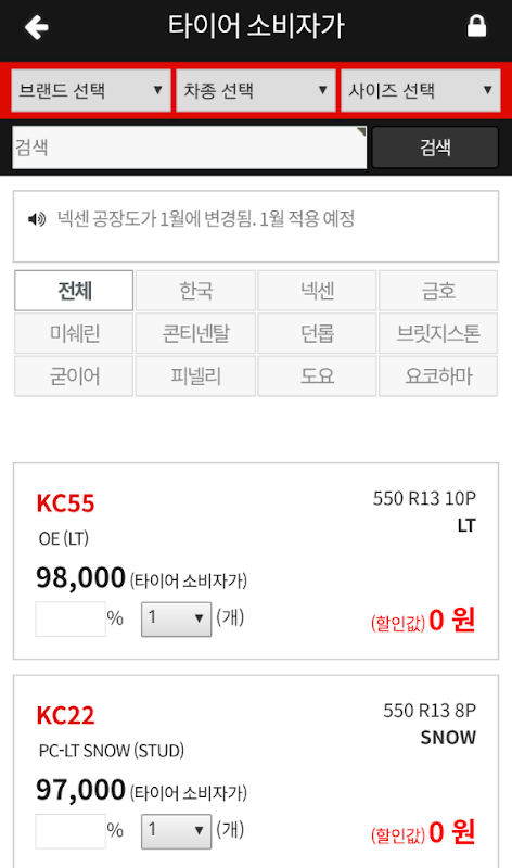 타이어 공장도가, 소비자가, 렌탈 부품업체 등 정보 가격 확인하시고