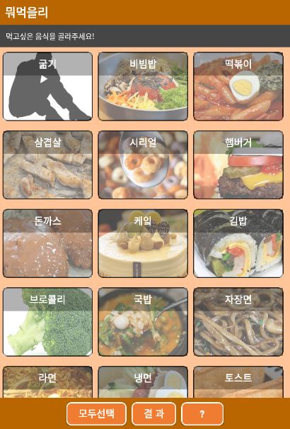 원하는 음식을 선택하면 무작위로 하나를 골라드립니다. 여러분이 좋아할 만한 다양한 메뉴가 준비되어 결정 문제 해결로는 딱입니다.