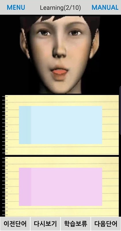 학습이 시작되면 각 단어별로 원어민 음성과 발음기관 애니메이션이 제시됩니다.