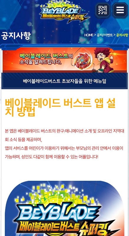 본 앱은 베이블레이드 버스트의 완구/애니메이션 소개 및 오프라인 지역대회 소식 등을 제공하며, 앱의 서비스를 어린이가 이용하기 위해서는 부모님의 관리 안에서 이용이 가능하며, 성인도 다같이 함께 이용할 수 있는 앱입니다.