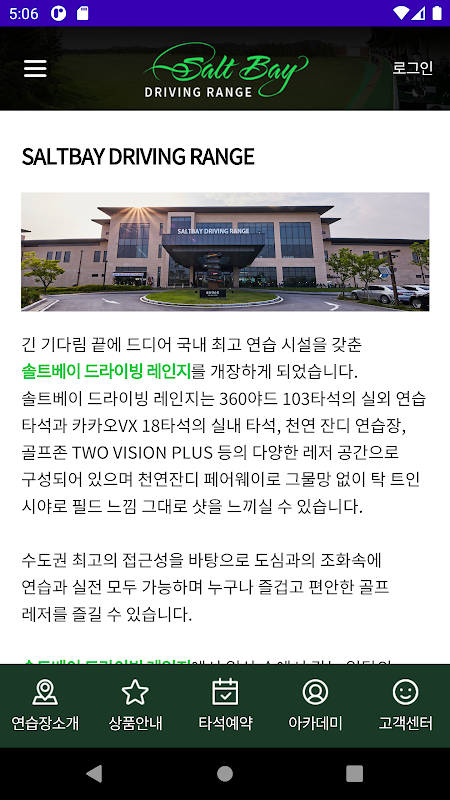 تبلغ مساحة ميدان القيادة في Salt Bay 360 ياردة ، و 103 مضرب تمرين في الهواء الطلق و 18 مضربًا داخليًا لـ Kakao VX ، وميدان قيادة من العشب الطبيعي ، ومنطقة الجولف Two VISION PLUS ، إلخ.