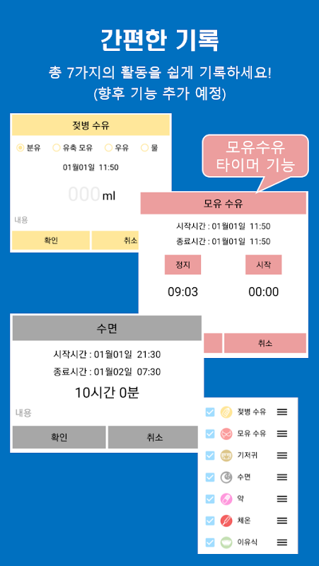 - 모유수유 : 왼쪽, 오른쪽 각각 타이머 기능