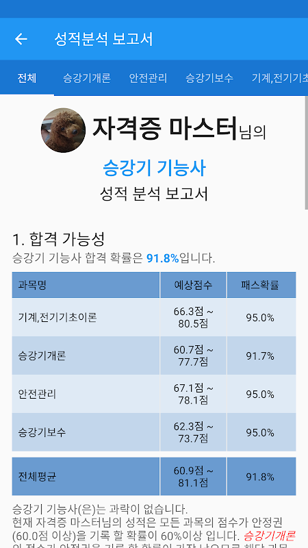 성적확인 - 각 과목별 성적 및 그동안 풀어본 기출문제와 모의고사, 문제풀기의 성적을 볼 수 있습니다.