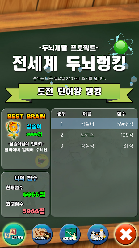 나의 순위를 랭킹보드에서 알아보세요. 1등이면 한마디 남길 수 도 있어요^^