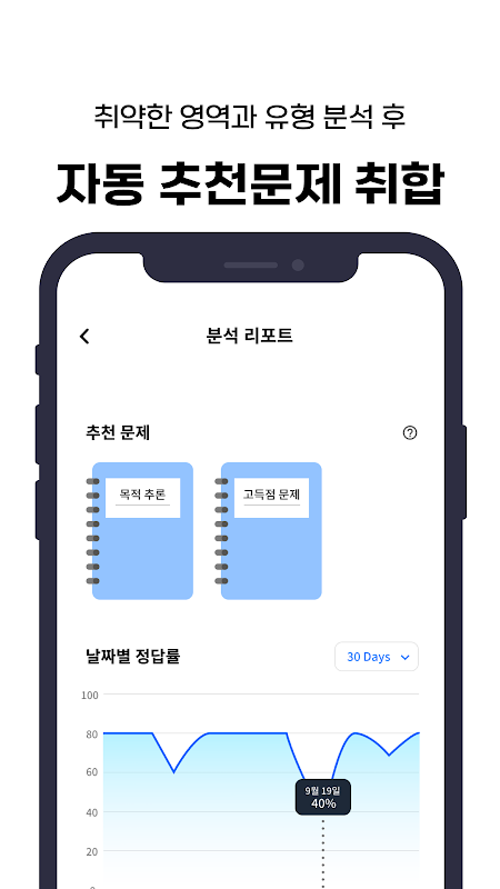 4. الرسوم البيانية المختلفة لمعدل الإجابة الصحيحة والمسائل الموصى بها: يمكنك تحديد مناطق أو أنواع الضعف لديك من خلال الرسوم البيانية لمعدل الإجابة الصحيحة حسب المنطقة، والمعدل الصحيح حسب التاريخ، والمعدل الصحيح حسب النوع، وحل نقاط الضعف لديك عن طريق حل المشكلات الموصى بها التي تم إنشاؤها بناءً على على هذا . .