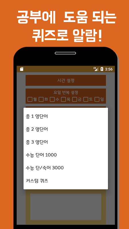 2. 중학교 영단어, 고등학교 영단어, 수능 영단어 문제를 풀어 알람을 해제할 수 있습니다.