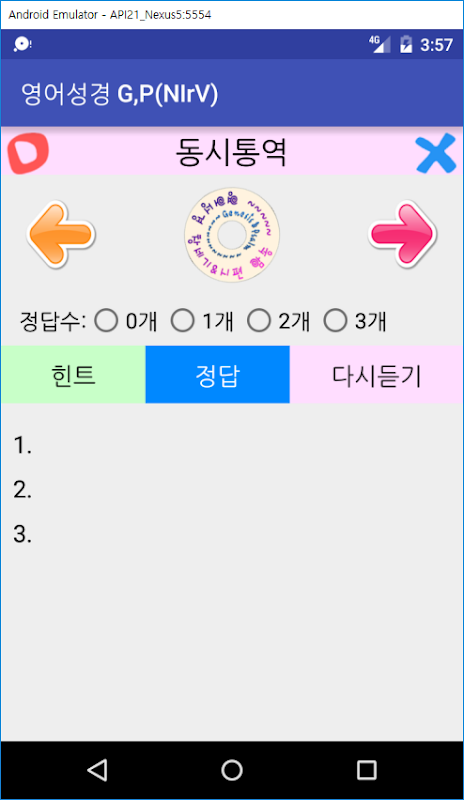 إذا kkamji في أيام المدرسة كانوا يكتبون هذه الأحكام حفظ عمياء القوة أيضا عقد الشاي أيضا فقدت الاهتمام بسرعة. يمكنني استخدام تقنيات مختلفة ليقرأ تمارين تحفيظ الكتاب المقدس متعة دائمة. الأول هو كيفية حفظ في نفس الوقت لفهم الانقسام إلى أجزاء ذات مغزى (معنى القطعة). كرر حتى كنت معتادا على القليل من الممارسة ومجموعة من قطع قطعة ذات مغزى وسيلة لحفظ جمل كاملة. ثانيا، من المهم معرفة ترتيب الكلمات الإنجليزية في طريق jikhae القراءة مباشرة. إذا كانت اللغة الإنجليزية هي بسرعة للخروج من الفم أول طلبية كلمة الكوري ويجب أن يكون على دراية ترتيب الكلمات من اللغة الإنجليزية الأخرى. ممارسة قراءة الكتاب المقدس jikhae طريقة القراءة المباشر يساعد على التفكير في ترتيب الكلمات الإنجليزية. عند تلاوة بهذه الطريقة يصبح ترتيب الكلمات في اللغة الإنجليزية تعلم التحدث باللغة الإنجليزية بشكل طبيعي يصبح حكما يخرج من الفم بسرعة. والثالث هو كيفية سماع الصوت من اللغة الأصلية التي تحاكي بالضبط. سمعت بيان صادر عن تسجيل الأصلي، إلى جانب إلقاء اقول تحاكي النطق فورا. قل لي 10 مرات، حتى تعتاد تماما إلى الفم، وفقا تكرار 20 مرة. كما ينطقها الأصلي والتجويد على دراية الفم أنها قادرة على التحدث باللغة الإنجليزية بطلاقة مثل اللغة الأم. والرابع أن يقرأ آيات الكتاب المقدس لمحاولة تجربة التفسير الظاهري. وفي الوقت نفسه زيادة التشويق هو كيفية زيادة التزام التلاوة. كما يشير التقرير إلى أن لدينا مترجم لغة يشير إلى الإنجليزية الأصلية بصوت عال لممارسة تلاوة من جملة واحدة. إذا كنت مجرد الخروج للتفكير بعض الوقت ولكن أنا لا أعرف، انقر مرة واحدة لا تذكر. ثم، بعد تكرار جزء غير معروف فإنه يمكن الطعن مرة أخرى. تنظيف الصور النمطية الخامسة أن تعطى وقتا طويلا لممارسة. ولو فترة قصيرة (بضع دقائق)، والوقت هو كيف يمكن أن تبدأ على الفور، بدوره على الهاتف الذكي. كنت لا داعي للقلق حول مكان LA كان من قبل. عند بدء تشغيل التطبيق سيتم تزويدها الجمل الإنجليزية التي حاولت في المرة السابقة. هذه المرة، لا تحتاج ليتم عرضها هنا. Doenikkayo حفظها تلقائيا.