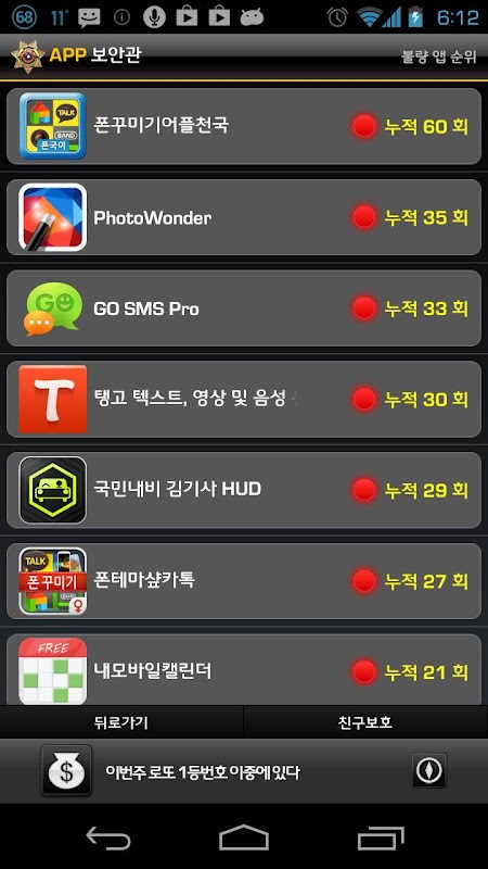 스마트폰에 설치된 앱의 안전도가 표시되는