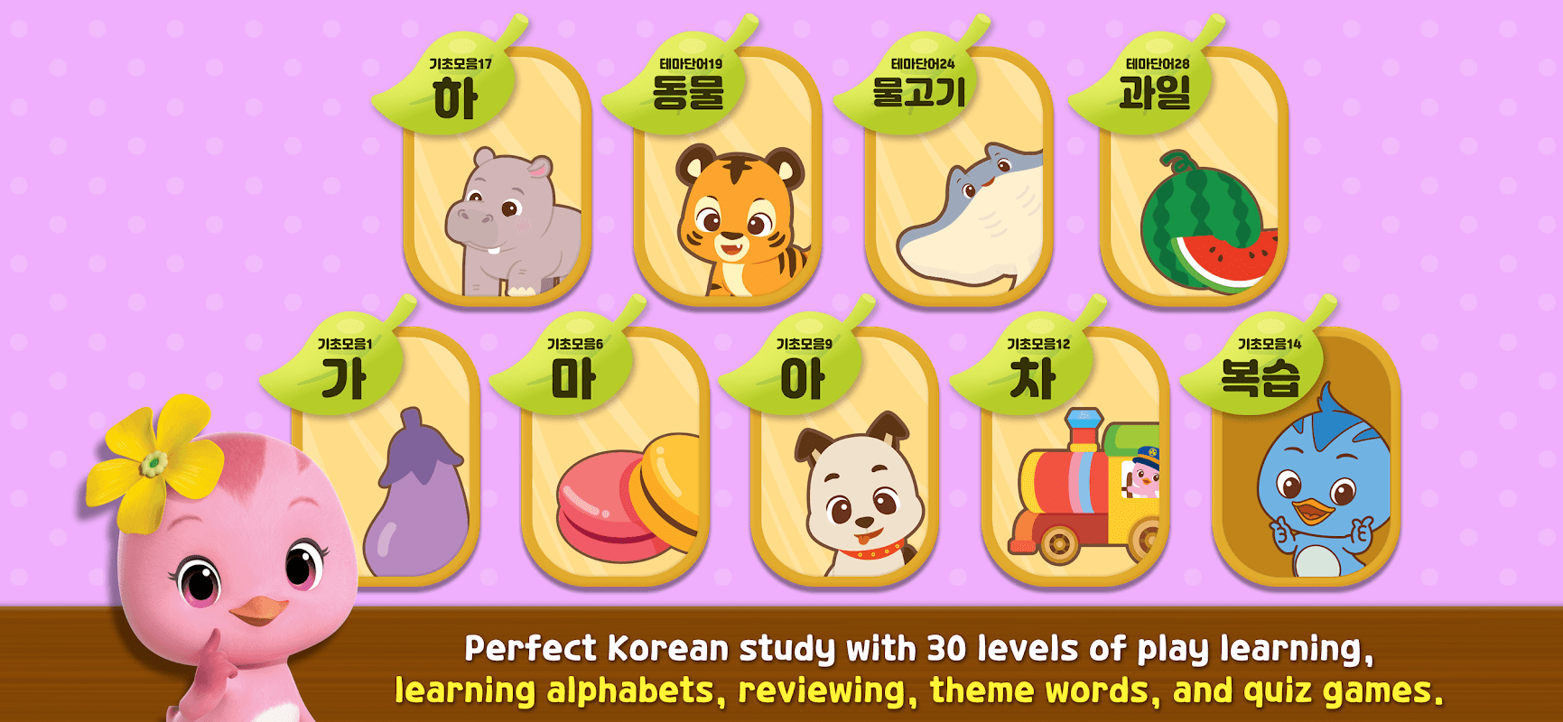 دراسة كورية مثالية مع 30 مستوى من التعلم باللعب، وتعلم الحروف الهجائية، والمراجعة، والكلمات الرئيسية، وألعاب المسابقات.