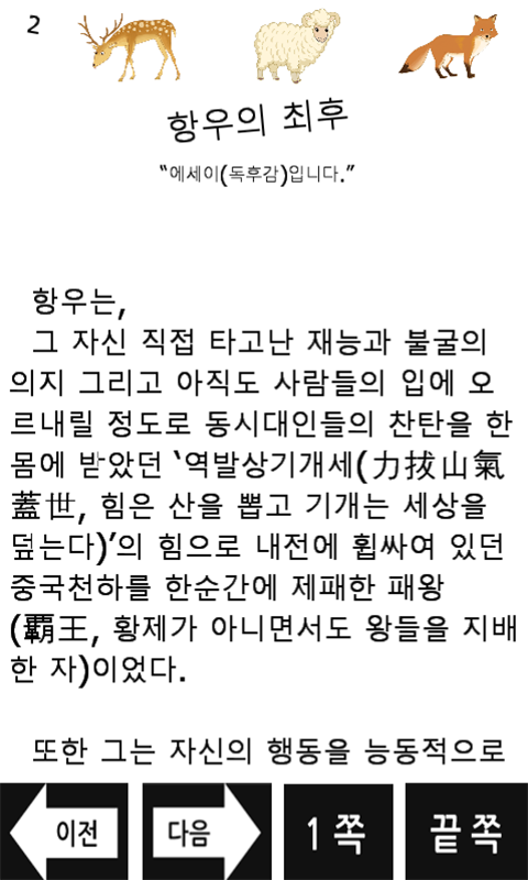 ◈ 앱의 줄거리 : “사마천 『사기』 「항우」본기를 읽고 느낌이 좋아 제가 느낀 점을 한 번 정리해보았습니다.” 에세이(독후감)의 결론은 “책을 다 읽고 나서는 심장이 뛰어 숨도 제대로 쉴 수 없을 지경이었다.”입니다~ :D