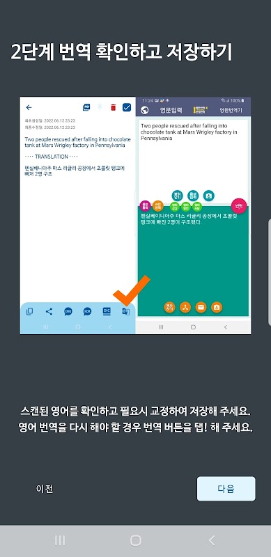 - 스캔된 영어를 확인하고 필요시 교정하여 저장해 주세요. 저장 후 영어 번역을 다시 해야 할 경우 번역 버튼을 탭! 해 주세요.