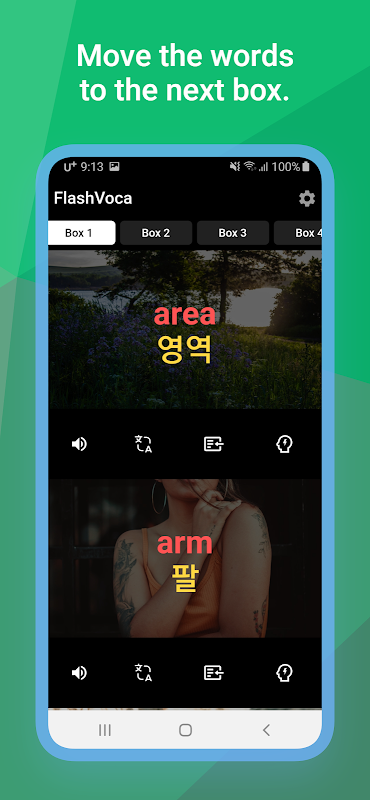 This English word learning app uses flash cards to show images and moves learners to the next box depending on whether they know the card or not. Provides repetitive learning to properly memorize words.