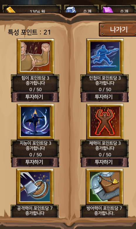 자동 사냥으로 획득한 골드로 스탯을 강화할 수 있습니다.