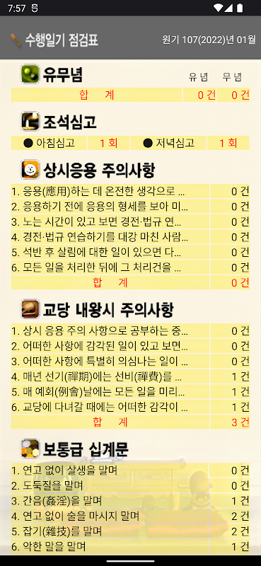 من الممكن تسجيل عدم اليقظة ، في الصباح والمساء ، واحتياطات التطبيق المستمرة ، والتنبيهات أثناء زيارات الكنيسة ، و gyeongmun ، والمذكرات العادية التي اقترحتها طريقة مذكرات وون البوذية.