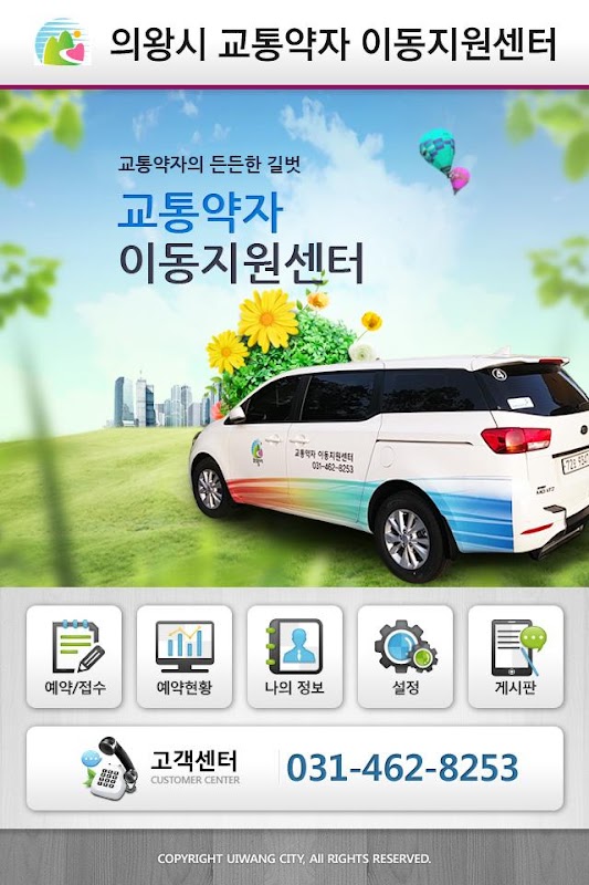 의왕 교통약자 이동지원센터는 예약/접수, 예약현황, 나의정보, 위치검색, 센터통화 기능이 있습니다.