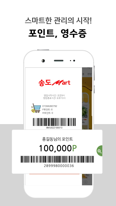 - (주)송도마트의 포인트 카드를 모바일로 편리하게 이용하시고, 언제 어디서든 포인트를 확인하실 수 있습니다.